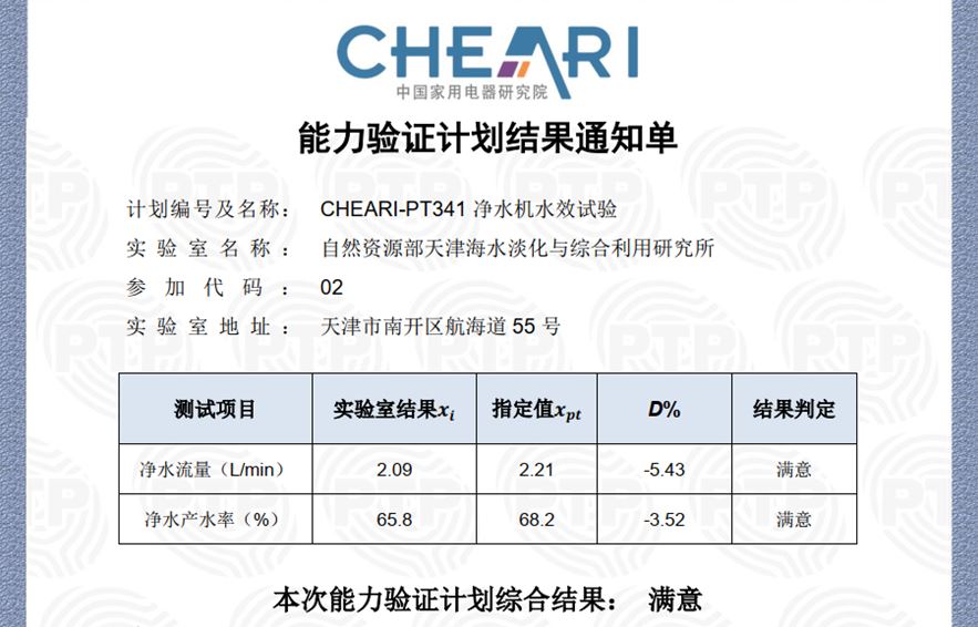 近日,国家海水及苦咸水利用产品质量检验检测中心再次收获证书,通过了由中国家用电器研究院于2024年11月组织的CHEARI-PT341净水机水效试验能力验证,结果获得“满意”。
